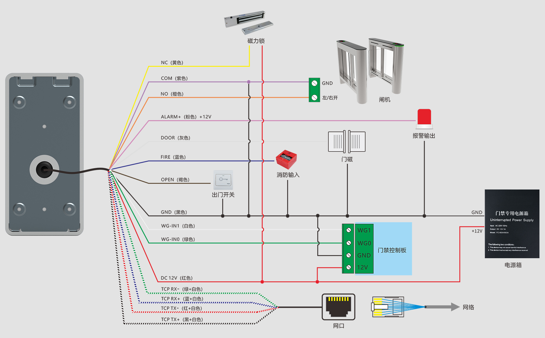 出門開關(guān)×1、門磁接口×1、報警輸出×1、Wiegand輸出×1、門鎖控制×1