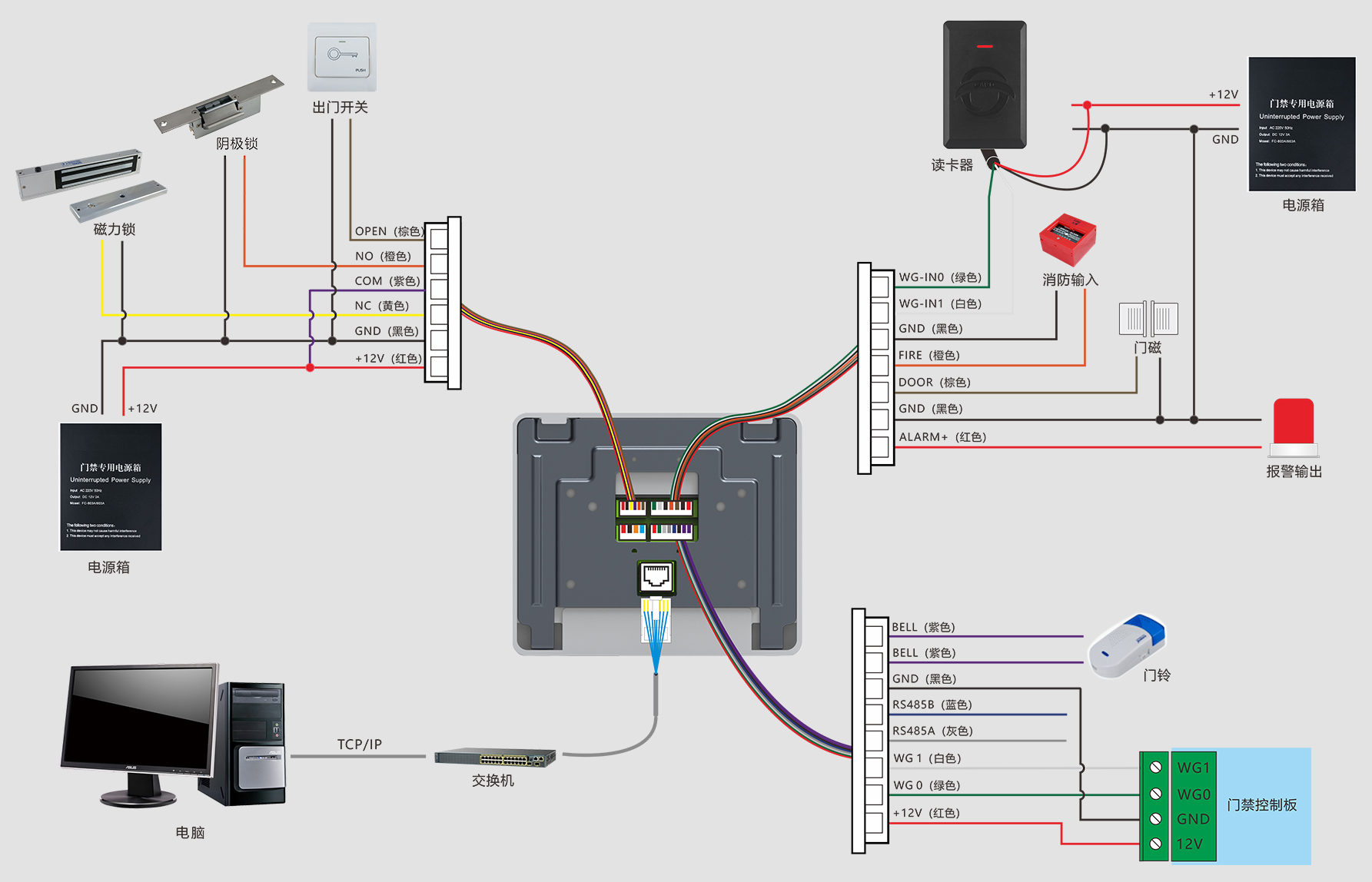 出門(mén)開(kāi)關(guān)×1、門(mén)磁接口×1、報(bào)警輸出×1、Wiegand輸出×1、門(mén)鎖控制×1