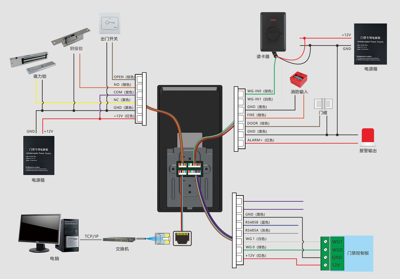 出門開關(guān)×1、門磁接口×1、消防輸入×1、報警輸出×1、Wiegand輸出×1、Wiegand輸入×1、門鎖控制×1、USB×1、RS485×1