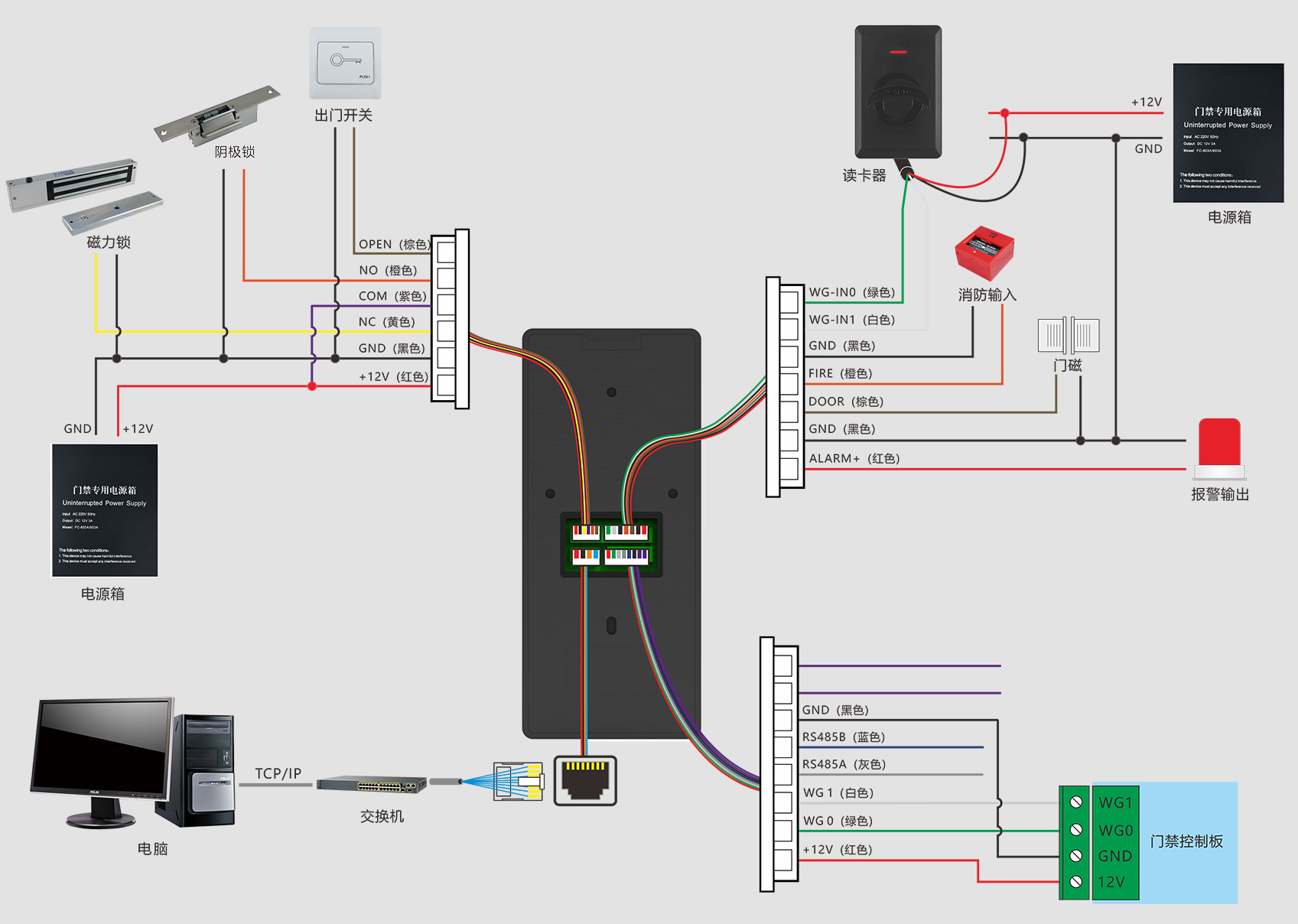 出門開關(guān)×1、門磁接口×1、消防輸入×1、報(bào)警輸出×1、Wiegand輸出×1、Wiegand輸入×1、門鎖控制×1、USB×1、RS485×1