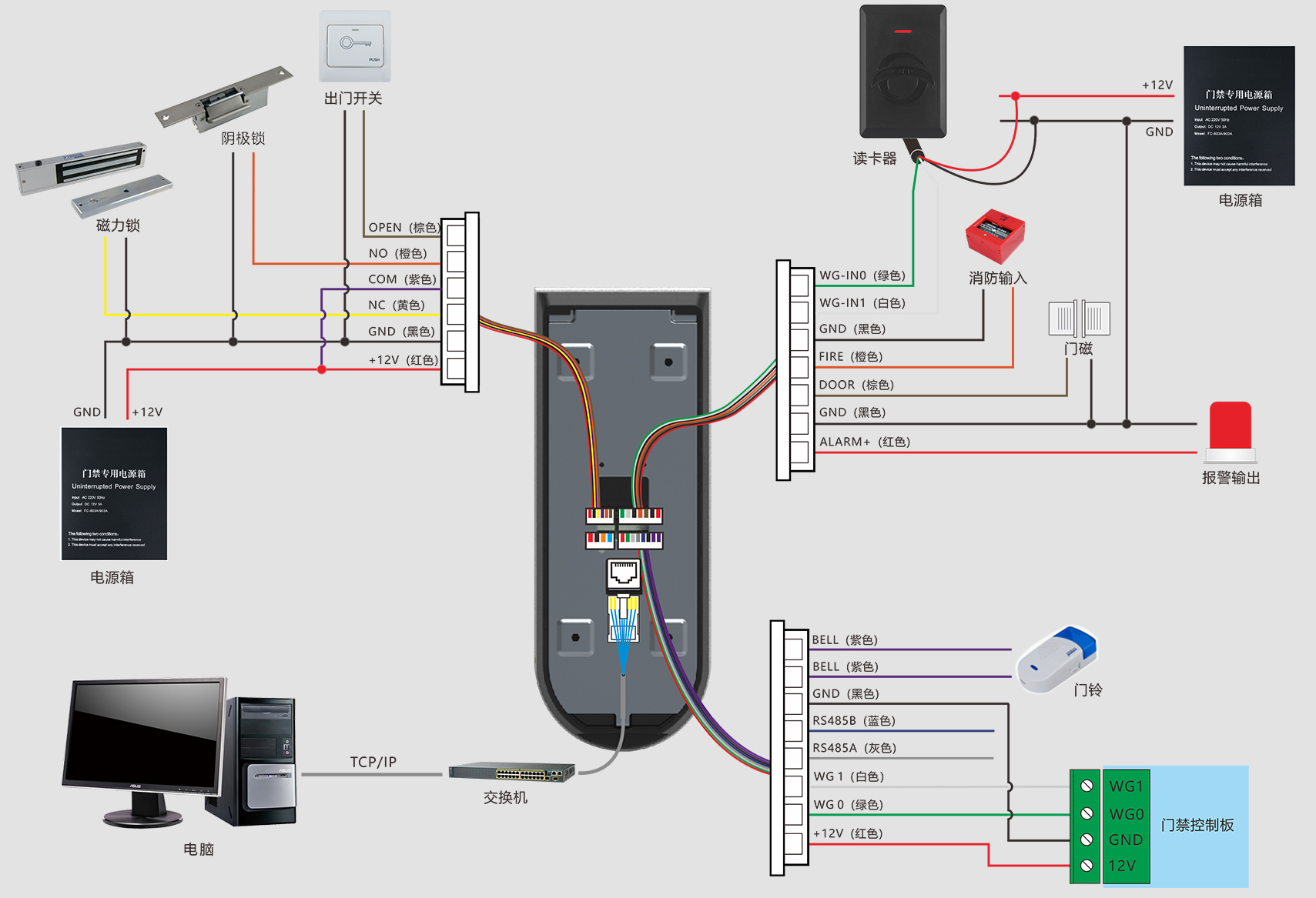 出門開關(guān)×1、門磁接口×1、消防輸入×1、報(bào)警輸出×1、Wiegand輸出×1、Wiegand輸入×1、門鎖控制×1、USB×1、RS485×1