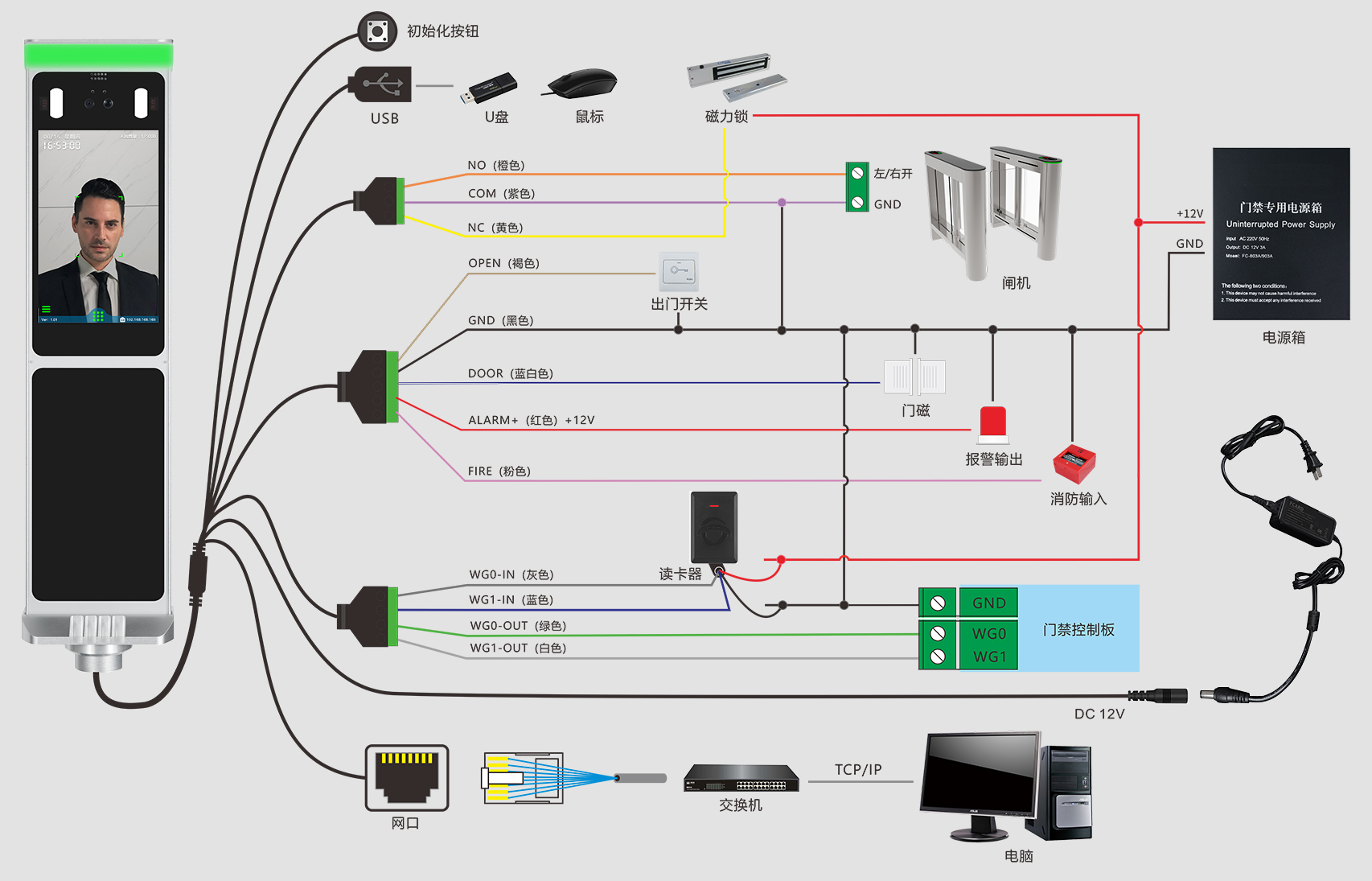 出門開關×1、門磁接口×1、消防輸入×1、報警輸出×1、Wiegand輸出×1、Wiegand輸入×1、門鎖控制×1、USB×1、RS485×1