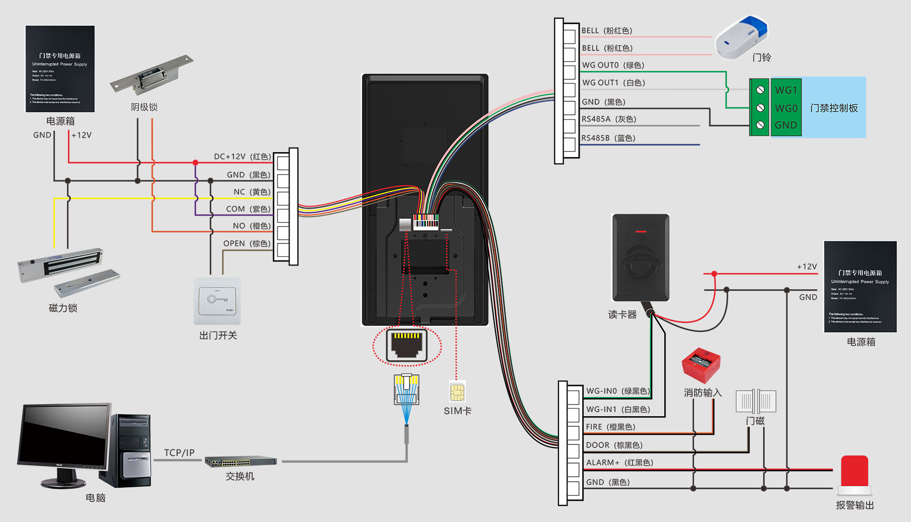 出門開關(guān)×1、門磁接口×1、消防輸入×1、報警輸出×1、Wiegand輸出×1、Wiegand輸入×1、門鎖控制×1、USB×1、RS485×1