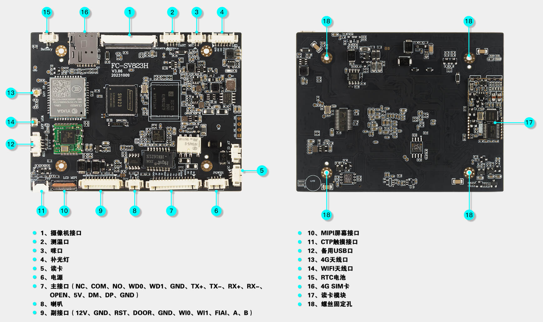 出門開關(guān)×1、門磁接口×1、消防輸入×1、報(bào)警輸出×1、Wiegand輸出×1、Wiegand輸入×1、門鎖控制×1、USB×1、RS485×1