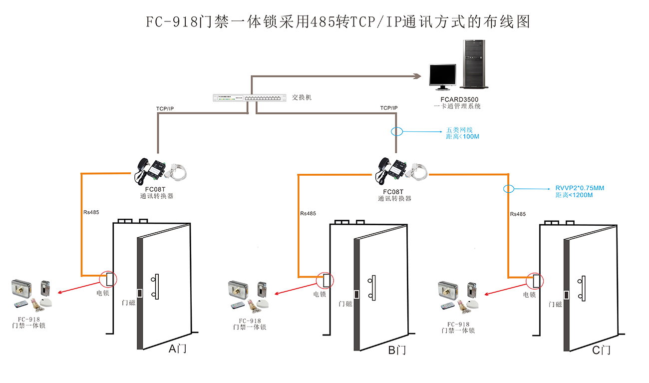 FCL-918門禁一體鎖 采用458轉(zhuǎn)TCP/IP通訊方式的布線圖