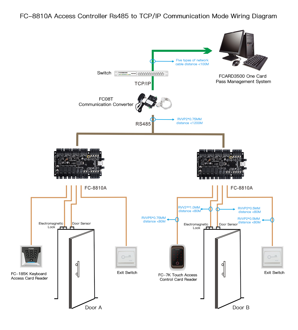 FC-8810A one door access controller RS485 transfer TCP/IP communication mode wiring diagram