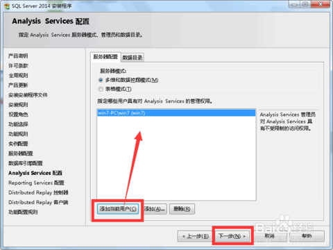 12.Analysis Services配置:這個是數(shù)據(jù)庫分析功能,添加個管理員進(jìn)來,然后"下一步":