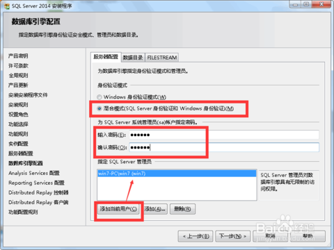 10.數(shù)據(jù)庫引擎配置:首先添加一個管理員,個人電腦的話直接添加當(dāng)前用戶,公用的話自行設(shè)置: