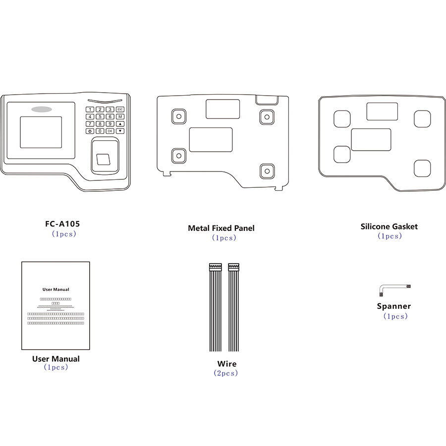 FC-A105 is a fingerprint time attendance access controller that supports networked access control and attendance. It adopts multi-core ARM processor, integrates massive memory, built-in live fingerprint recognition circuit, supports high-speed recognition and rejection of fake fingerprints. Fingerprint recognition time <1S, adopts 2.8-inch TFT color screen, support 5000 fingerprints, 5000 cards, 5000 passwords, 200,000 records, support ID card (optional support Mifare card), TCP/IP networking, RS485 networking, support 1 group of door opening relay, 1 group of door sensor, 1 group of alarm output, support U disk backup data, support cloud platform. Simplified Chinese, English (other languages can be customized)