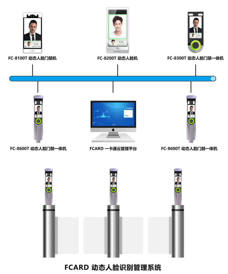 由動(dòng)態(tài)人臉門禁一體機(jī)、門禁電源、通道閘、FCARD3500軟件等組成。