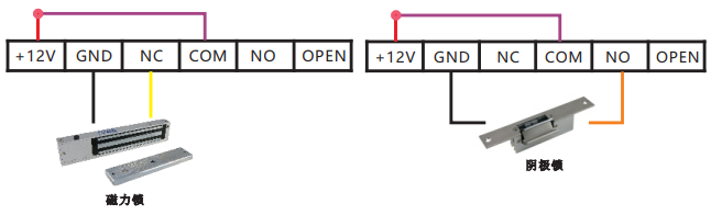 磁力鎖或電插鎖(通電關(guān)門型電鎖):電鎖的正極接到人臉機(jī)NC(黃色線),電鎖的負(fù)極接到人臉機(jī)GND(黑色線),然后人臉機(jī)COM(紫色線)和+12V(紅色線)并接到一起。