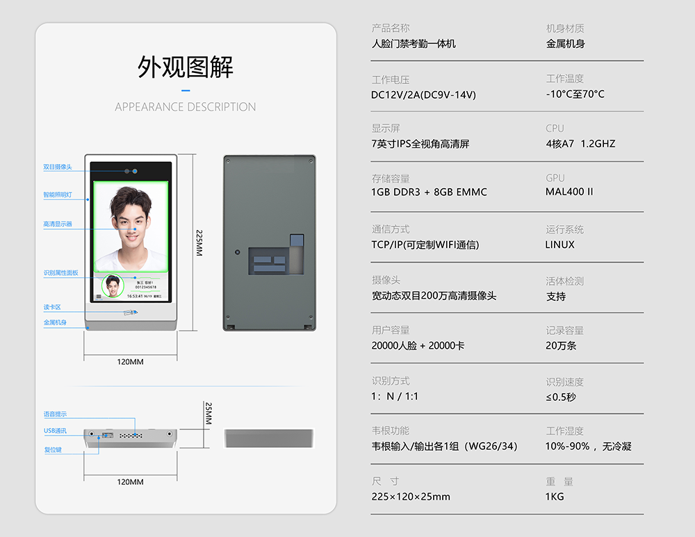 您好,歡迎使用我們的產(chǎn)品,謝謝您的支持。以下是FC-8200T人臉門禁機(jī)的技術(shù)參數(shù)圖:
