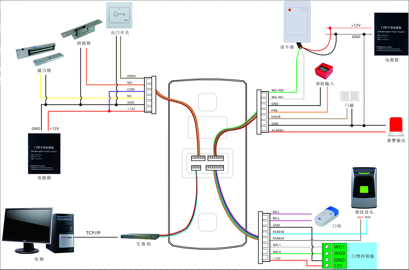 麻煩提供一下FC-A102E/M指紋門禁考勤一體機的連線圖,謝謝。