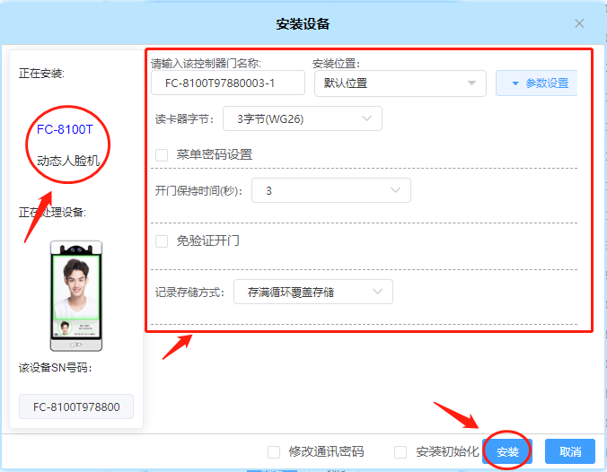 在【安裝設備】頁面,輸入人臉機SN碼,點擊【確定】。SN碼驗證通過,打開【安裝設備】頁面,填寫人臉機參數(shù),點擊【安裝】,如圖7-2所示: