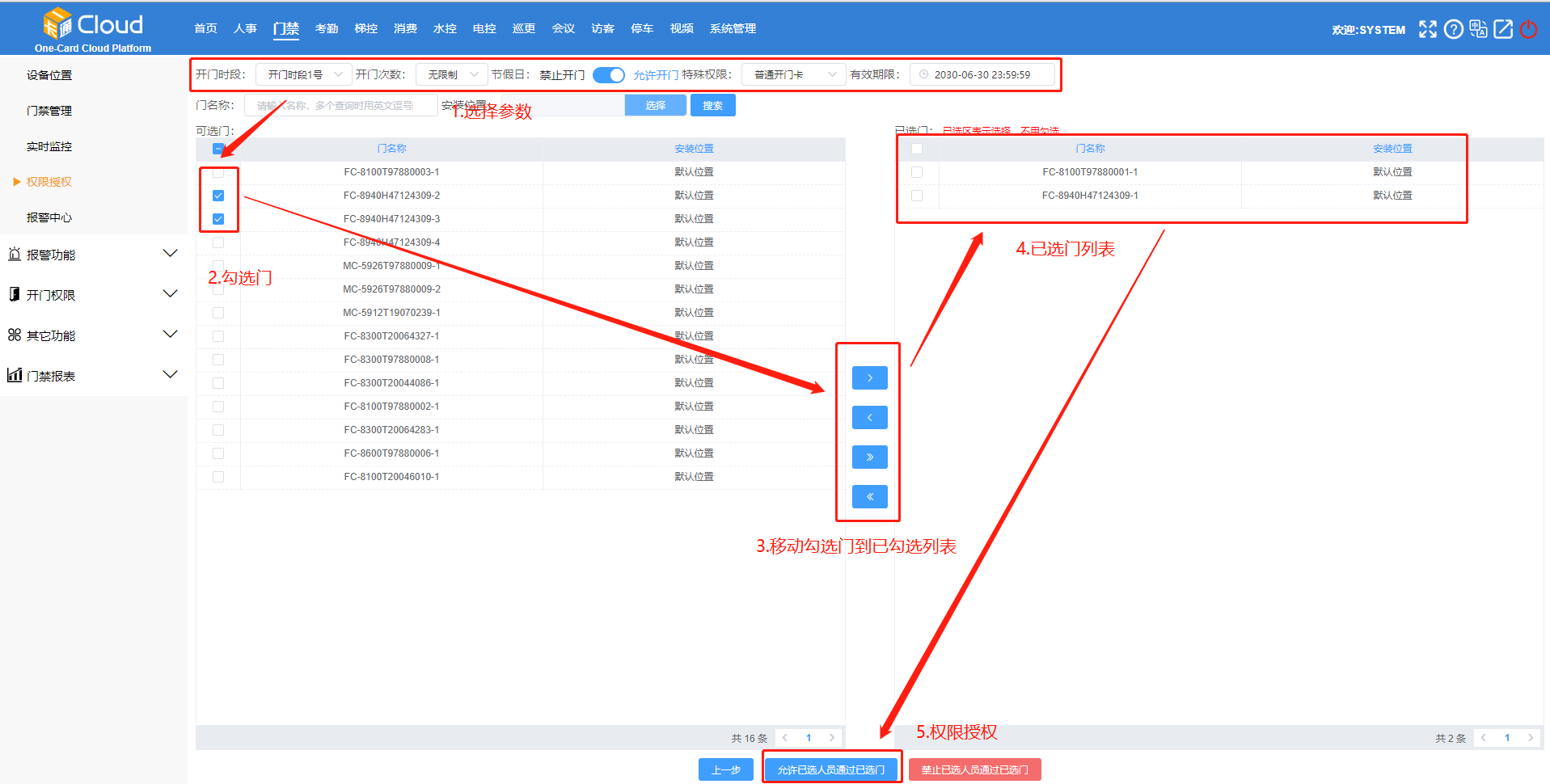 勾選授權(quán)設(shè)備-點擊【下一步】-填寫參數(shù)-點擊【允許已選人員通過已選門】。