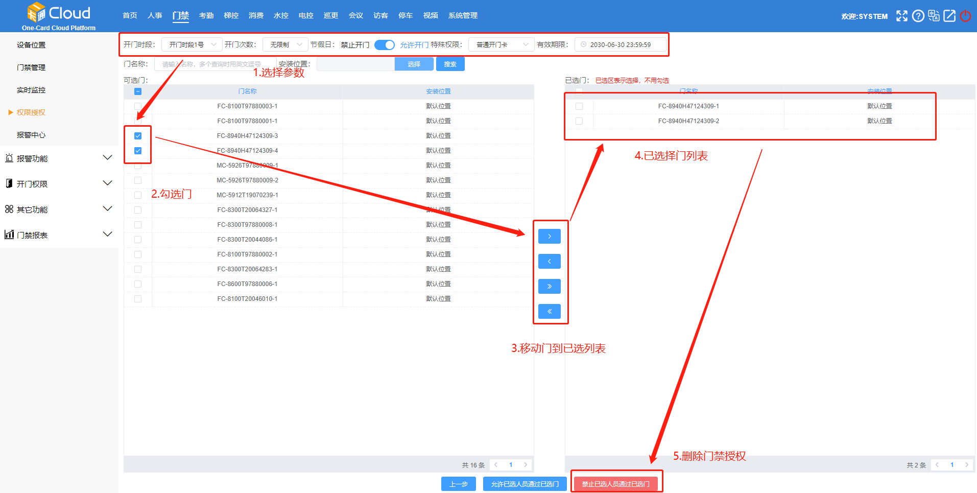 點擊【門禁】-【人員授權】-勾選人員-點擊【下一步】。如下圖所示: