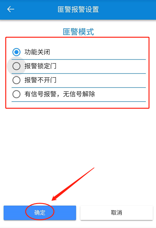 在【匪警警報】頁面,勾選門禁-【設(shè)置】-選擇【匪警模式】-點擊【確定】。如下圖所示: