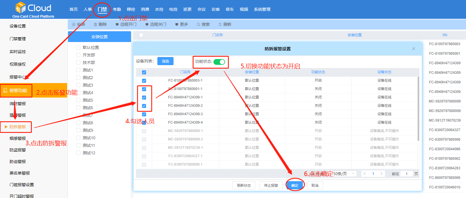 在【防拆警報(bào)】頁(yè)面,勾選門禁-點(diǎn)擊【開啟】或【關(guān)閉】。如下圖所示: