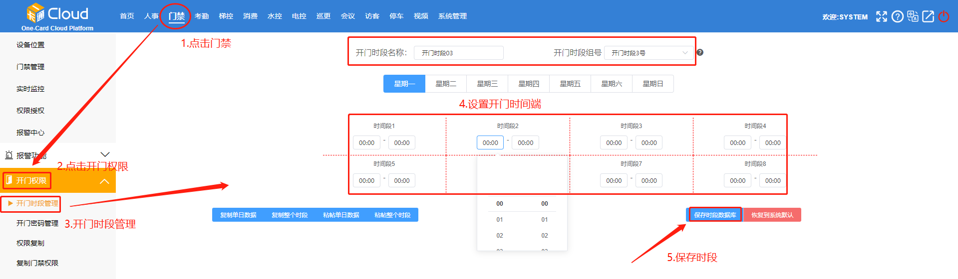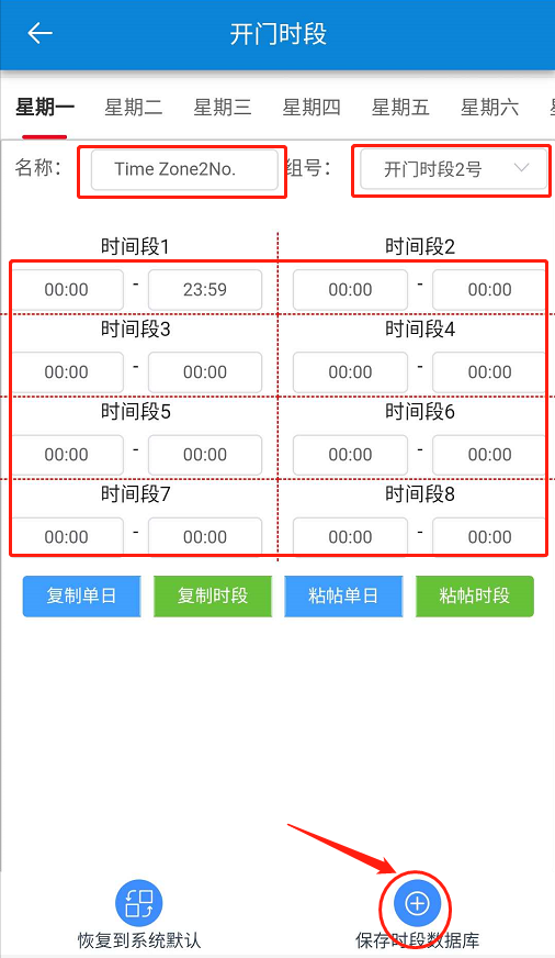 在【開門時段】頁面,設(shè)置時間段-保存時段數(shù)據(jù)。如下圖所示: