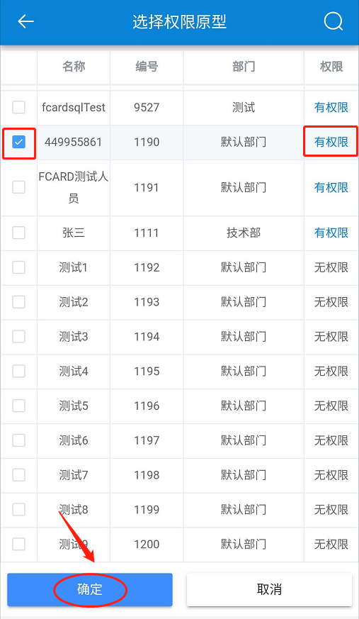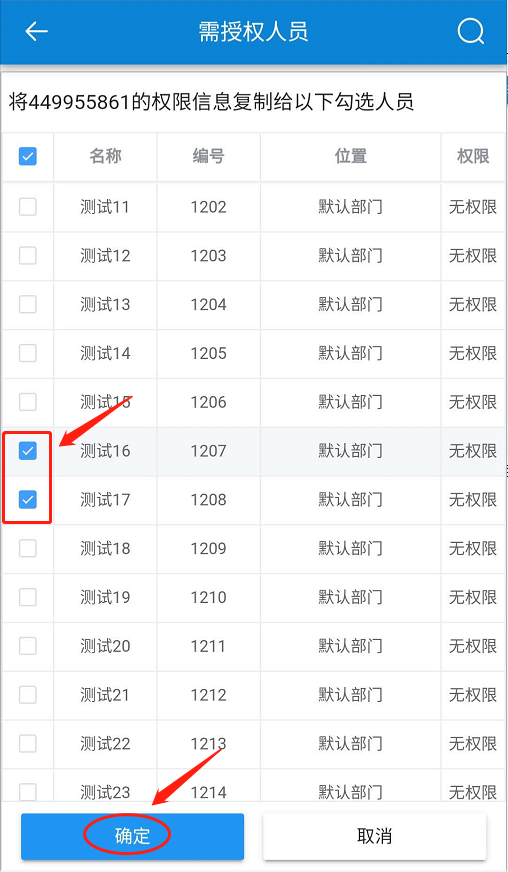 在【選擇權(quán)限原型】頁面,選擇一個有權(quán)限人員作為復(fù)制模板-在【需授權(quán)人員】頁面,選擇人員-點擊【確定】-選擇【權(quán)限設(shè)置】-點擊【確定】。如下圖所示: