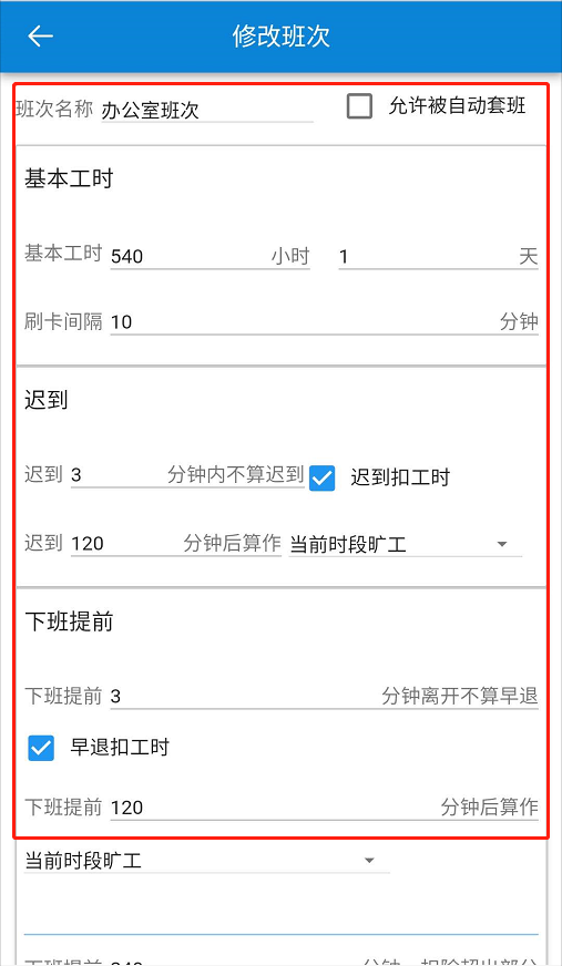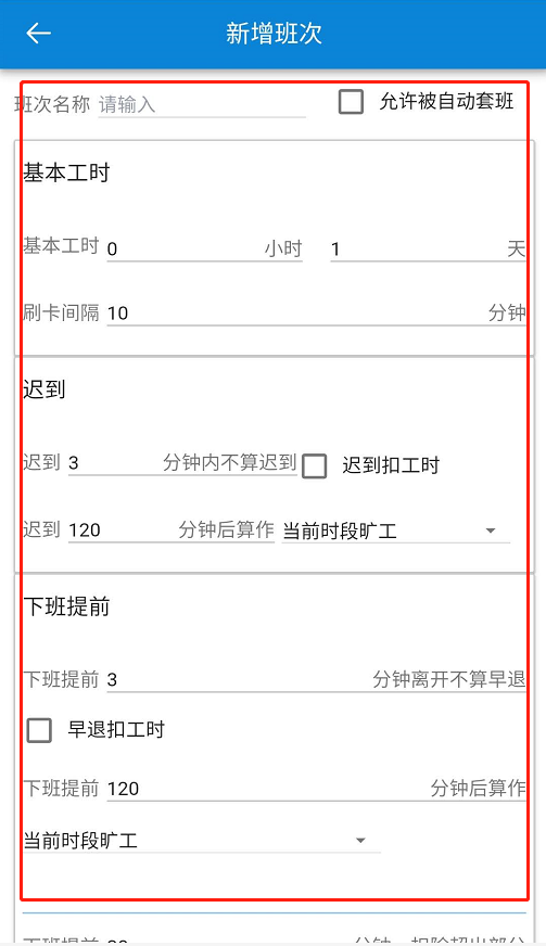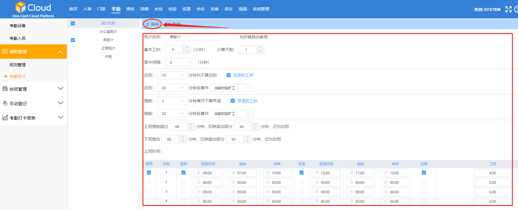 設(shè)置班次名稱、基本工時、遲到、早退、加班等情況,以及可以設(shè)置具體的上下班時間,簽到簽退時間。