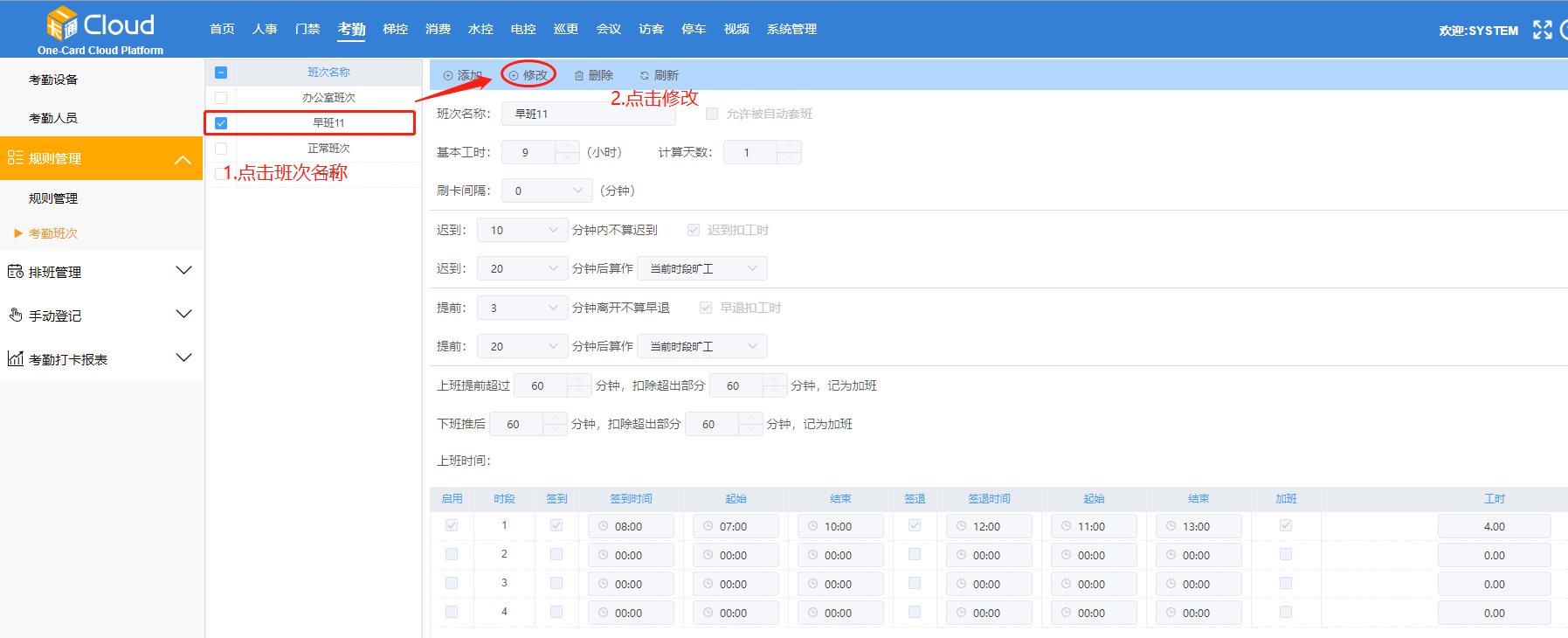 在【考勤班次】頁面-點(diǎn)擊班次名稱(如圖中早班11)-【修改】,即可編輯考勤班次參數(shù)。如圖23-3所示: