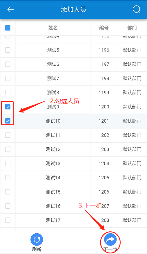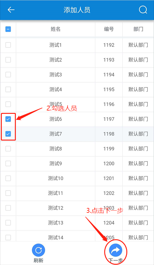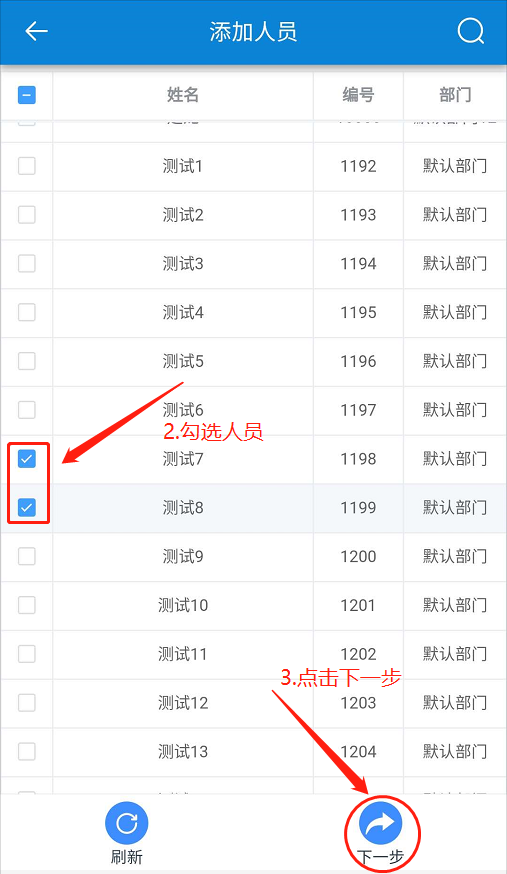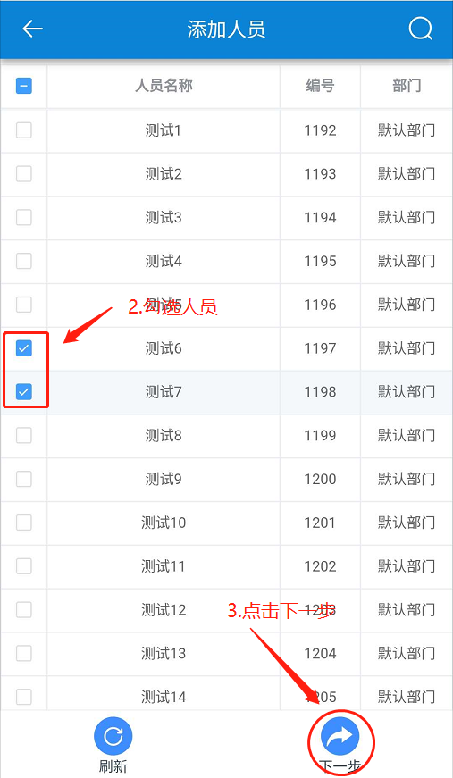 在【加班】頁面,點(diǎn)擊【添加】-勾選人員-點(diǎn)擊【下一步】-設(shè)置【加班時(shí)間、備注】-點(diǎn)擊【確定】。如下圖所示: