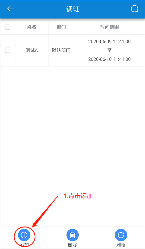 在【調(diào)班】頁面,點(diǎn)擊【添加】-勾選人員-點(diǎn)擊【下一步】-設(shè)置【調(diào)班時(shí)間、備注】-點(diǎn)擊【確定】。如下圖所示: