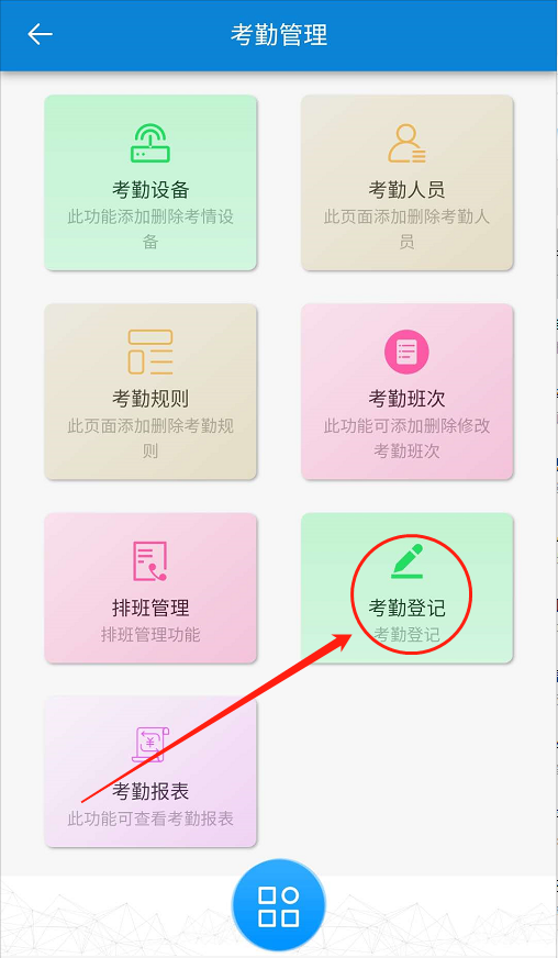 點(diǎn)擊【考勤】-【考勤登記】-【補(bǔ)卡】。如下圖所示: