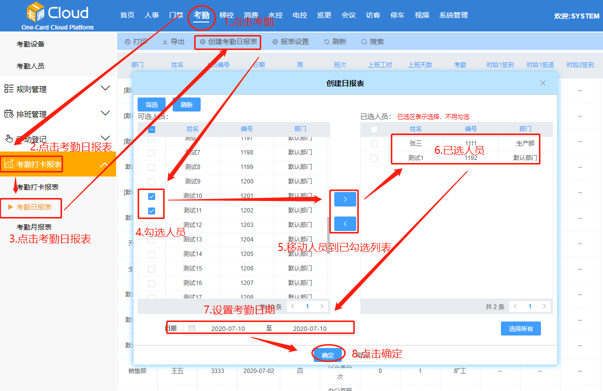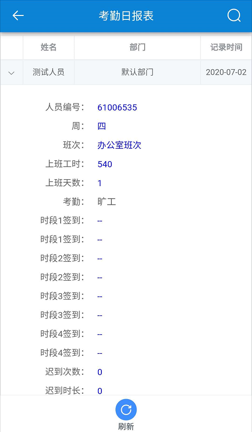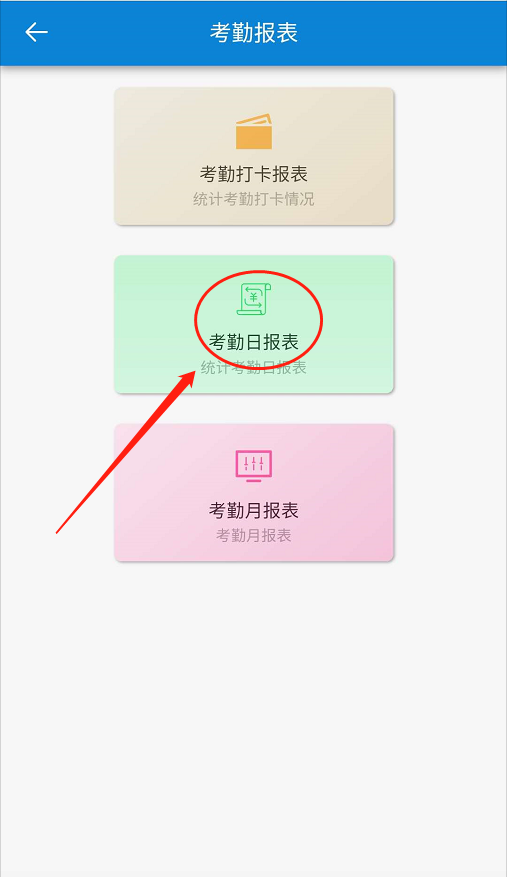 點擊【考勤】-【考勤報表】-【考勤日報表】。如下圖所示: