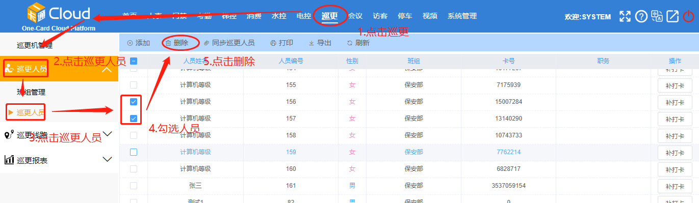 點(diǎn)擊【巡更】-【巡更人員】-勾選人員-點(diǎn)擊【刪除】。如下圖所示: