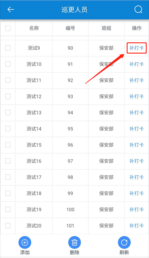 點(diǎn)擊【巡更】-【巡更人員】-【補(bǔ)打卡】-設(shè)置補(bǔ)打卡【巡更點(diǎn)、登記日期、備注】-點(diǎn)擊【確定】。如下圖所示:
