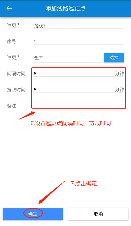 在【在新增路線巡更點(diǎn)】頁面-設(shè)置【間隔時(shí)間、寬限時(shí)間】-點(diǎn)擊【確定】。如圖37-4所示: