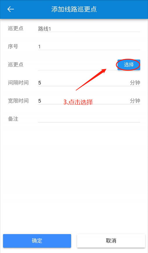 回到【添加線路巡更點(diǎn)】頁面,設(shè)置【間隔時(shí)間、寬限時(shí)間】-點(diǎn)擊【確定】回到【添加線路】頁面,勾選巡更點(diǎn)-點(diǎn)擊【確定】。如下圖所示: