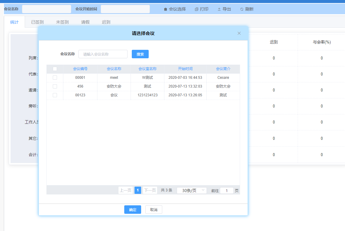 彈出會(huì)議選擇窗口,選擇一個(gè)會(huì)議進(jìn)行統(tǒng)計(jì)