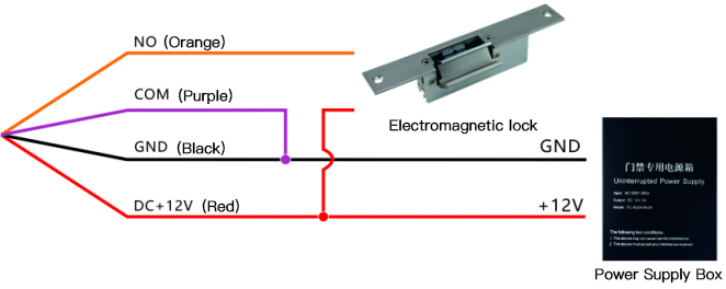 Strike lock or electric control lock (electric lock with power on to open the door): the negative electrode of the electric lock is connected to the face recognition access controller NO (orange wire), the positive electrode of the electric lock is connected to the face recognition access controller DC+12V (red wire), and then the face recognition access controller COM ( Purple wire) and GND (black wire) are connected in parallel.