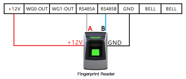 Hello, welcome to use our products, thank you for your support. FC-A102E/M Fingerprint and Time Attendance Access Controller Supports the function of a master phone, you can connect a set of dedicated fingerprint heads to achieve linkage recognition for entry and exit. The fingerprint head power supply can be directly powered by the fingerprint access controller, the fingerprint head +12V is connected to the fingerprint access controller +12V (red wire), the fingerprint head RS485A is connected to the fingerprint access controller RS485A (gray wire), and the fingerprint head RS485B is connected to the fingerprint access controller RS485B (blue wire) , the fingerprint head GND is connected to the fingerprint access controller GND (black wire). (When the fingerprint access controller is used as a fingerprint head, it needs to be set to the "slave mode", and the dedicated fingerprint head defaults to the slave mode, no need to set.)