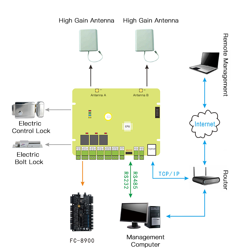 Hello, we have a project to monitor the number of people in a mine area, and there is no system wiring diagram. We are now considering using your long-distance card reader to automatically read the personnel information passing through the area, and then count it to the central database to understand the current number of people in each area in real time. Now I want to know how to wire.