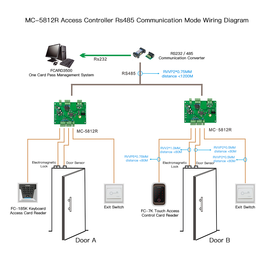 MC-5812R One Door Access Control Board, RS485 Communication Mode Wiring Diagram