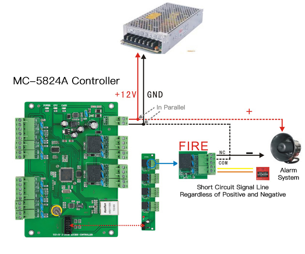 Connection Diagram of MC-5824A Access Control Board and Fire Alarm