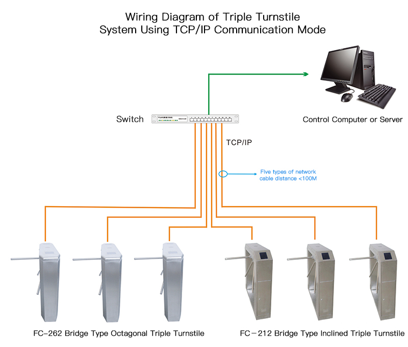 Hello, thank you for your attention to our company, the Triple Turnstile system developed by our company and our company’s access control system can be connected through a switch, for the specific connection method, you can refer to the wiring diagram of the Triple Turnstile system using TCP/IP communication provided to you below. You can also call the toll free number: 400-688-6663.